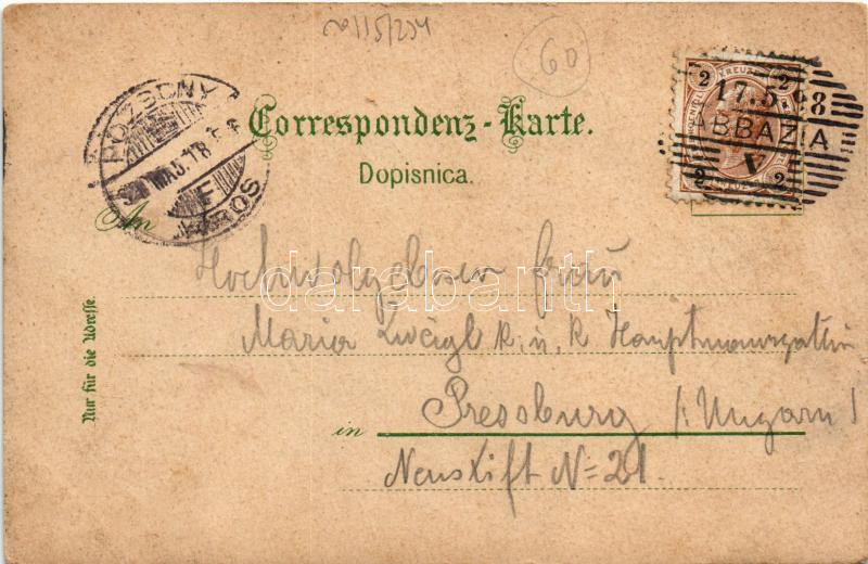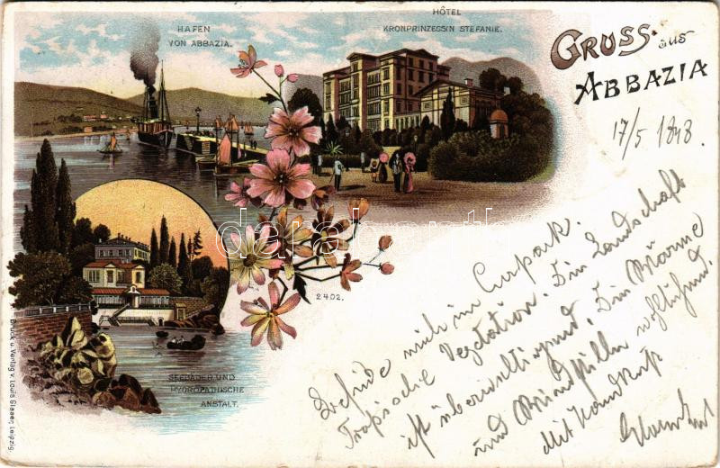 1898 Abbazia, Opatija; Hafen von Abbazia, Hotel Kronprinzessin Stefanie, Seebäder und Hydropatsiche Anstalt / port, hotel, spa, beach. Druck u. Verlag Louis Glaser Art Nouveau, floral, litho (fa)