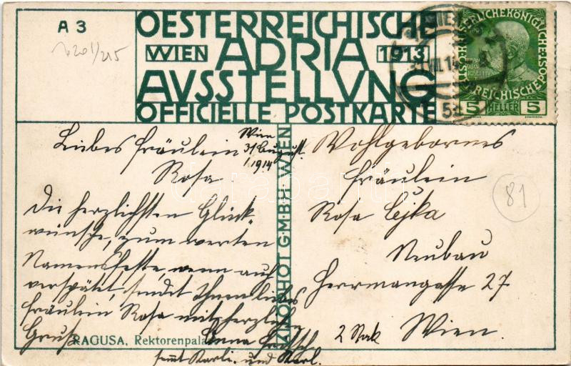 Leírás: 1914 Dubrovnik, Ragusa; Rektorenpalast. Oesterreichische Adria Ausstellung Wien 1913 Officielle Postkarte A 3. Kilophot GMBH / Austrian Adria Exhibition. Art Nouveau litho s: Hans Kalmsteiner (gyűrődés / crease)