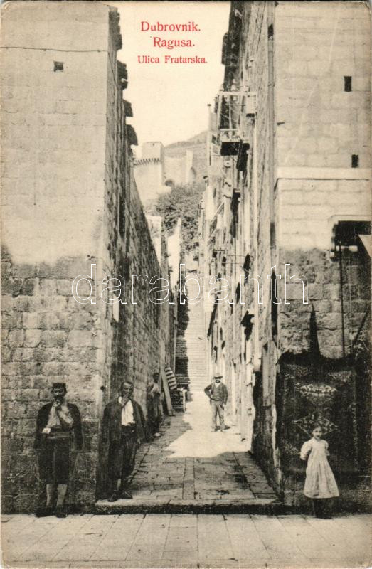 Dubrovnik, Ragusa; Ulica Fratarska / street view (EK) https://www.darabanth.com/hu/45-Nagyaukcio/45.1/Kepeslapok/Horvatorszag~18766/Dubrovnik-Ragusa-Ulica-Fratarska-street-view-EK~II3454714