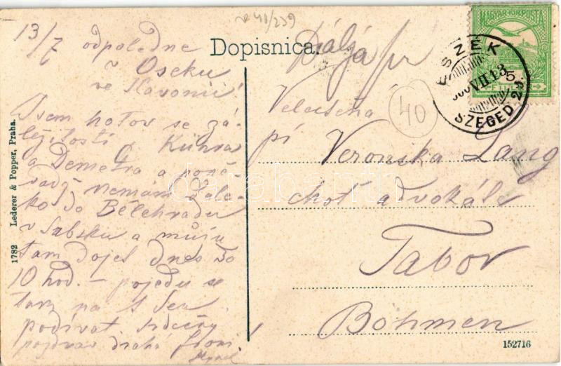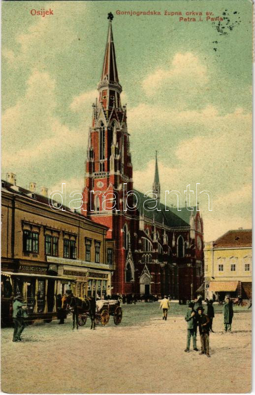 Eszék, Essegg, Osijek; Gornjogradska zupna crkva sv. Petra i. Pavla / Plébániatemplom, villamos, gyógyszertár, drogéria, Seidling & G. Slavek, Vilim Glesinger üzlete / parish church, tram, drugstore, pharmacy, shops + "ESZÉK - SZEGED 29." vasúti mozgóposta bélyegző