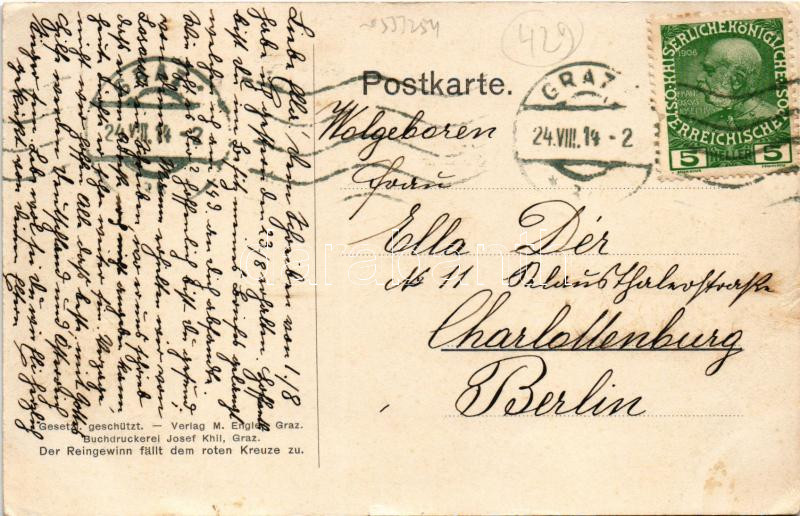 1914 Vöröskeresztes propaganda lap katonával és nővérrel / WWI K.u.K. military, Red Cross propaganda, nurse with soldier. M. Engler, Buchdruckerei Josef Khil (Graz) (EB)