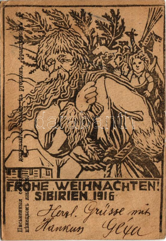 1916 Frohe Weihnachten! Sibirien 1916 / Pour les prisonniers de guerre / Első világháborús orosz hadifogoly levelezőlap, karácsonyi üdvözlet, Magyarországra küldve / WWI K.u.K. military, POW (prisoner of war) field postcard sent to Hungary from Russia, Christmas greetings (EB)
