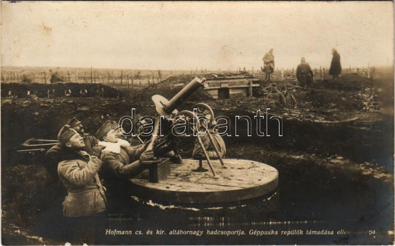 Géppuska repülők támadása ellen (légvédelmi géppuska) a Strypa mentén. Hofmann cs. és kir. altábornagy hadcsoportja felvétele. Hadifénykép Kiállítás, Hadsegélyező Hivatal kiadványa / WWI Austro-Hungarian K.u.K. military, soldiers with anti-aircraft gun along the Strypa river (Ukraine) (fl)