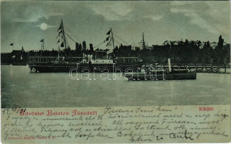 Leírás: 1899 Balatonfüred, kikötő, gőzhajó este holdfényben. Johannes Haacke kiadása (EK)