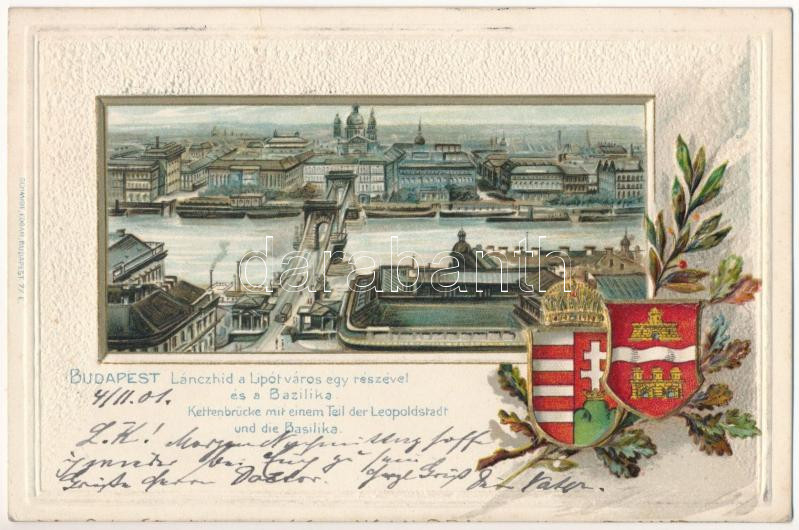 1901 Budapest, Lánchíd, Lipótváros egy része és a Bazilika. Magyar címeres dombornyomott litho keret / Emb. litho frame with Hungarian coat of arms (lyuk / pinhole)