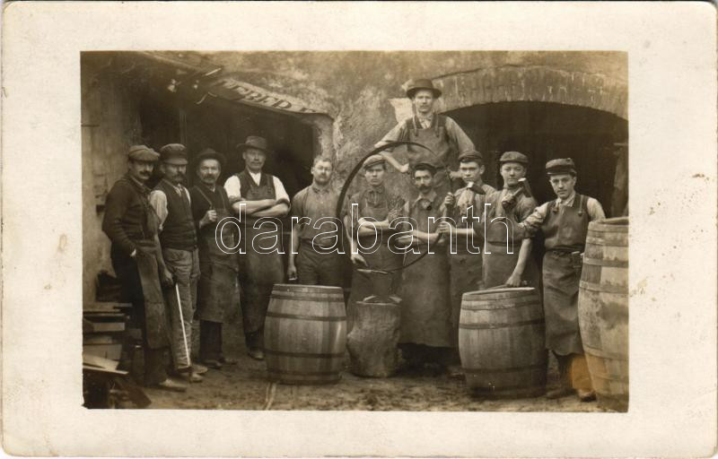 1911 Budapest XXII. Budafok, kádár üzem, hordógyártó munkások csoportj... https://www.darabanth.com/hu/45-Nagyaukcio/45.1/Kepeslapok/Magyarorszag~18763/1911-Budapest-XXII-Budafok-kadar-uzem-hordogyarto-munkasok-csoportja-Veber-felirat-pho~II3433827