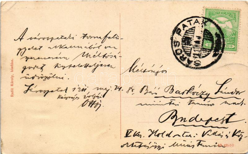 1911 Sárospatak, Református főiskola, főiskolai könyvnyomda. Báró Barkóczy Sándor (1857-1925) miniszteri tanácsos, császári és királyi kamarásnak címezve. Radil Károly kiadása (fl)