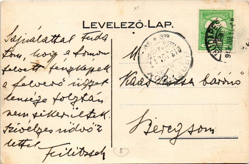 Leírás: 1913 Budapest XI. Feilitzsch Berthold báró villája, hátoldalán saját kezű levelével, Kaas Rózsa bárónőnek címezve. Ménesi út 8/a (EK)