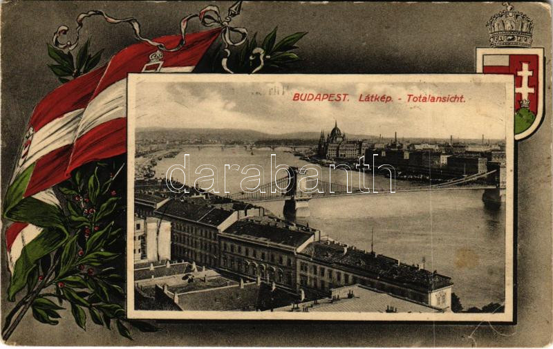 Leírás: 1915 Budapest, látkép Budáról a Dunával. Szecessziós magyar zászlós és címeres keret, Art Nouveau (EK)