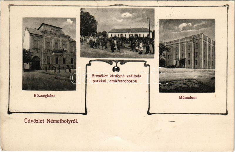 1916 Bóly, Németbóly; Községháza, Erzsébet királyné (Sisi) szálloda parkkal és emlékszoborral, Műmalom. Makart fényképész felvételei (Mohács), Art Nouveau + "K.u.K. Ersatzkompagnie des b.-h. F. J. B. Nr. 2." (gyűrődés / crease)
