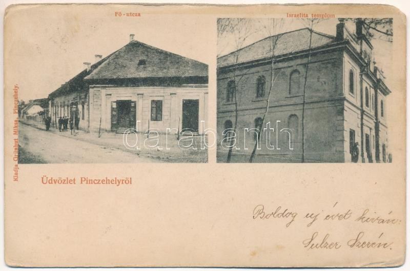 Leírás: Pincehely (Tolna), Fő utca, üzlet, Izraelita templom, zsinagóga. Grünhut Miksa kiadása (EM)