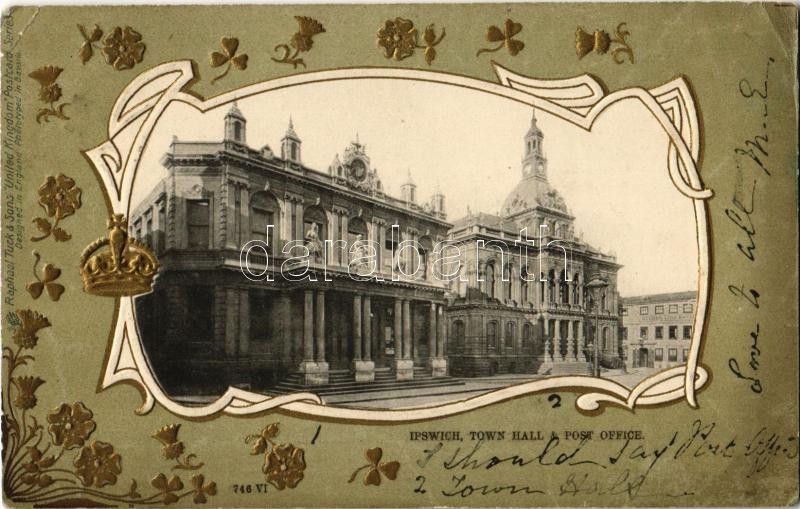 Leírás: 1902 Ipswich, Town hall and post office. Raphael Tuck & Sons "United Kingdom" Postcard Series 746/VI. Art Nouveau, Emb. (EK)