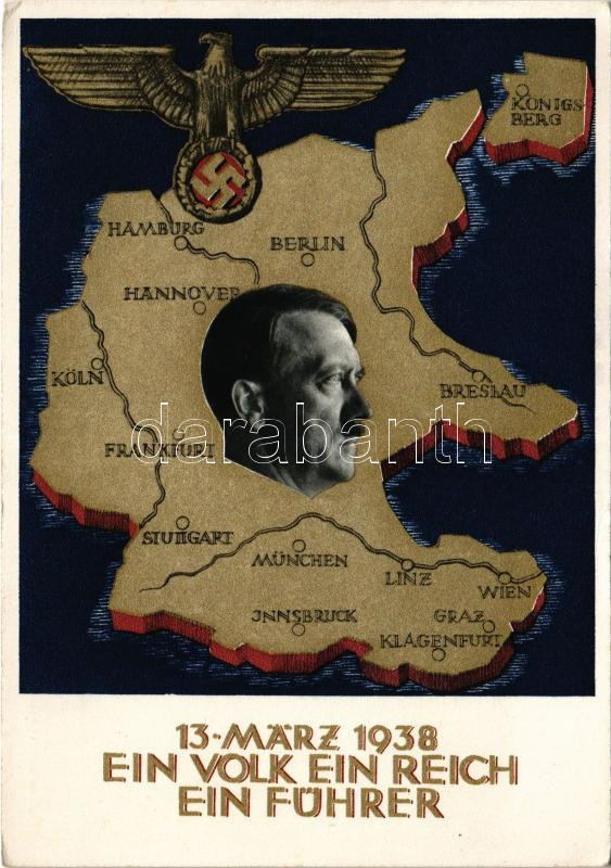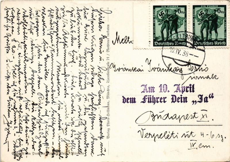 1938 Ein Volk, ein Reich, ein Führer! / Adolf Hitler, NSDAP German Nazi Party propaganda, map, swastika s: Professor Richard Klein + "Am 10. April dem Führer dein "Ja"" So. Stpl. (EK)