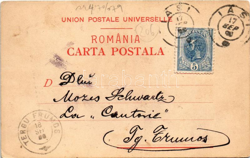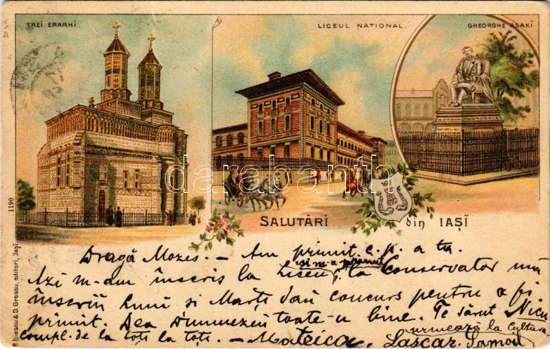 1898 Iasi, Jasi, Jassy, Jászvásár; Trei Erarhi, Liceul National, Gheorghe Asaki / Romanian Orthodox church and monastery, grammar school, monument. Art Nouveau, floral, litho with coat of arms (tear)