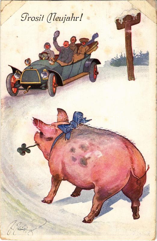 1916 Prosit Neujahr! B.K.W.I. 3000-5. / New Year greeting art postcard... https://www.darabanth.com/hu/45-Nagyaukcio/45.1/Kepeslapok/Udvozlolapok-Unnepek~18856/1916-Prosit-Neujahr-BKWI-3000-5-New-Year-greeting-art-postcard-with-pig-and-people-in-automo~II3448073