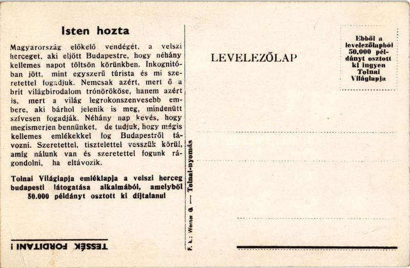 Leírás: A velszi herceg Budapesten. A Tolnai Világlapja díjtalan emléklapja / Edward VIII, Prince of Wales visiting Budapest (EB)