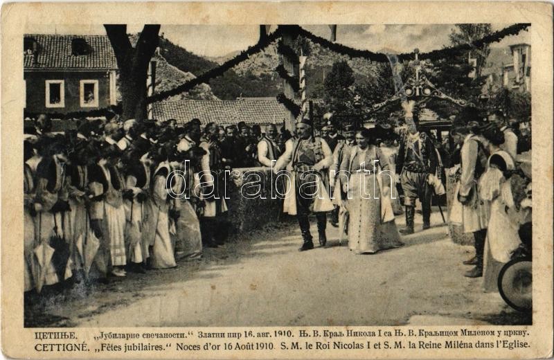 Cetinje, Cettigne; Fetes jubilaires, Noces d'or 16 Aout 1910. S.M. le Roi Nicolas I et S.M. la Reine Miléna dans l'Eglise / jubileumi fesztivál, a montenegrói király és királyné látogatása / Jubilee Festival, Nicholas I of Montenegro and Milena of Montenegro (EK)