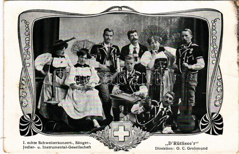 Leírás: I. echte Schweizerkonzert-, Sänger-, Jodler- u. Instrumental-Gesellschaft. D'Rüdtlisee'r. Direktion: O.C. Grolimund. Gebr. Wittenbecher / Swiss concert, singer, yodeler society. floral (EK)