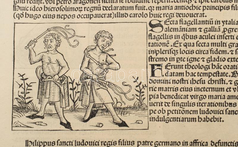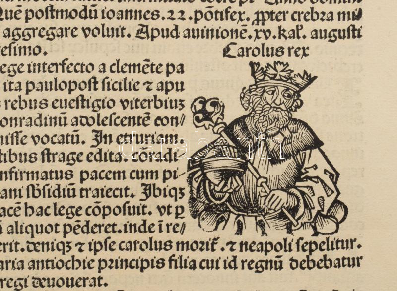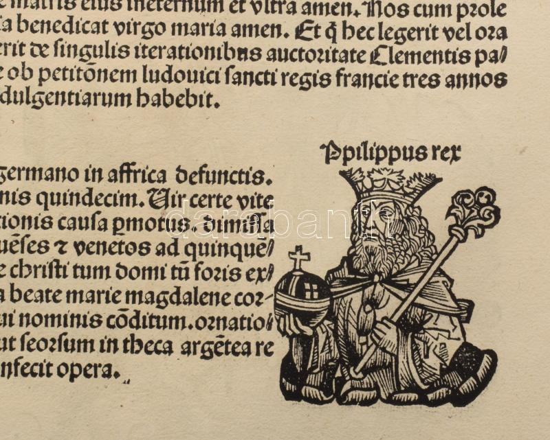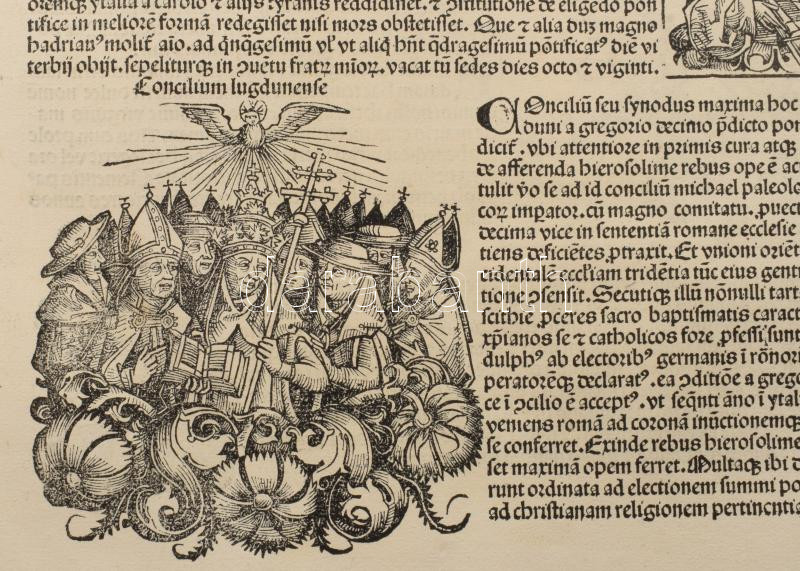 1493 Ősnyomtatvány - a híres Schedel krónika Magyar vonatkozású lapja, rajta középkori uralkodók és egyházi méltóságok fametszetű képével. A személyek között szerepel többek között Aquinói Szent Tamás. A hátoldalán a II. lyoni zsinat leírását és femetszetű képét láthatjuk. A zsinat és Magyarország közötti legfontosabb kapcsolat IV. (Kun) László magyar király (1272?1290) uralkodásához köthető. A zsinat egyik fő témája az volt, hogyan szervezzenek új keresztes hadjáratot a Szentföld visszafoglalására. Ennek részeként Magyarországot is bevonták a tervekbe, mivel a Magyar Királyság a keresztesek egyik fontos átvonulási útvonala volt. A pápa (X. Gergely) kifejezetten kérte a magyar király támogatását, és engedélyezte, hogy a magyar egyház is részt vegyen az új adók beszedésében, amelyek a keresztes hadjáratot szolgálták. 1493.-ban jelent meg az első nyomtatott világkrónika, amelyben Buda legrégibb hitelesnek tekinthető látképe is fennmaradt. A könyvnek számos magyar vonatkozása is van. A mintegy 600 lapos, nagyméretű ősnyomtatvány a 15. századi könyvművészet kimagasló emléke. A Lap mérete 32x46 cm. Művelődéstörténeti és könyvtörténeti kuriózum. RITKASÁG!