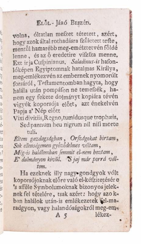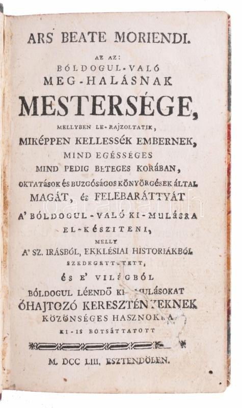 1753 Hevessy Sámuel: Ars beate moriendi. Az az Bóldogul-való meg-halásnak mestersége, Mellyben le-rajzoltatik, miképpen kellessék embernek, mind egésséges mind pedig beteges korában, oktatások és buzgóságos könyörgések által magát, és felebaráttyát a? bóldogul-való ki-mulásra el-késziteni?óhajtozó keresztényeknek közönséges hasznokra ki-is botsáttatott. H. n. 1753. ny. n. [22] + 175 + [2] p. Első kiadás. Korabeli, kopottas, keménytáblás papírkötésben.
