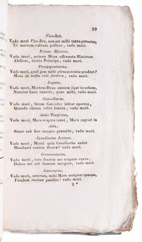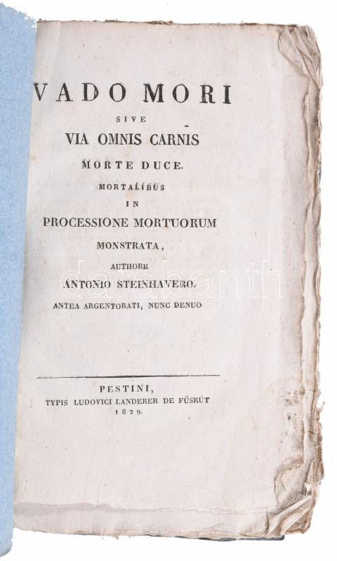 1829 Antonio Steinhavero - Vado Mori (Haláltánc) Nagyon ritka, kiadói papírborítóban. A haláltánc (francia danse macabre) késő középkori eredetű allegorikus műfaj, mely a költészetben, a képzőművészetben, a zenében és a színjátszásban egyaránt előfordul. A korábbi hagyományokból a 14. század második felében született meg a haláltánc, mely az élőket képben és versben figyelmeztette a halál közelségére. Költeményekben, fametszeten, templomfali ábrázoláson a halál rendszerint csontváz formájában táncba viszi, majd sírba kényszeríti a legkülönbözőbb társadalmi típusokat képviselő embereket. A táncmotívum kereszténység előtti hiedelmekre utal, melyek szerint a temetőben éjjel táncra kelnek a halottak, de hajnalhasadásig vissza kell feküdniük a sírba. Forrását a középkori keresztény világkép megrendülésében, a társadalmi ellentétek felszínre törésében s a pestisjárványok pusztításaiban kell keresnünk. A haláltánc-ábrázolások allegorikusan arra utalnak, hogy a halál előtt minden ember egyenlő. Képzőművészetben kiemelkedő A Halál diadalát ábrázoló pisai freskó, Buonamico Buffalmacco alkotása és ifjabb Hans Holbein negyven fametszete a 16. század első feléből. A zenében a Dies irae gregorián dallamban jelenik meg motívuma, amit több zeneműben is feldolgoztak (például Hector Berlioz Fantasztikus szimfóniája, Liszt Ferenc Haláltánca). Az irodalomban igazi vándortémává vált, számos nemzet költészetében felbukkan. Egyes motívumai megjelennek Villon költészetében és napjainkig több műalkotásban is.