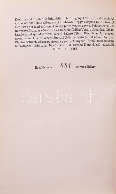 Dosztojevszkij, Fjodor Mihajlovics: Bűn és bűnhődés. Ford.: Görög Imre és G. Beke Margit. Bp., 1966, Magyar Helikon, 529+3 p. Kiadói aranyozott egészbőr-kötésben, kiadói papír védőborító, jó állapotban. Számozott (441./1200) példány!
