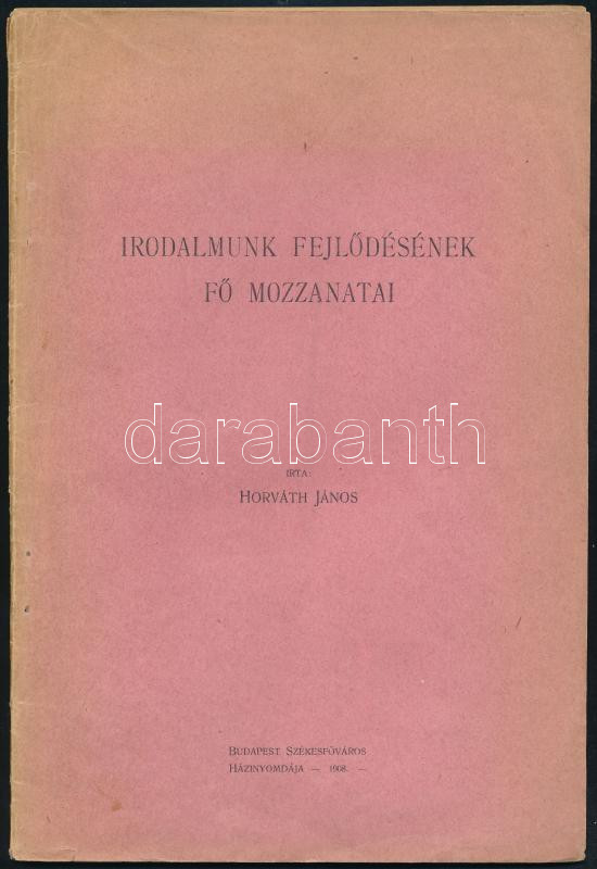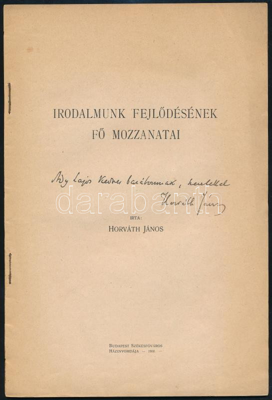 Horváth János: Irodalmunk fejlődésének fő mozzanatai. A szerző, Horváth János (1878-1961) irodalomtörténész, egyetemi tanár, az MTA tagja által Ady Lajos (1881-1940) író, főgimnáziumi tanár, tankerületi főigazgató, Ady Endre öccse részére dedikált példány (,,Ady Lajos kedves barátomnak, szeretettel Horváth János"). Bp., 1908, Budapest Székesfőváros Házinyomdája, 50 p. Kiadói tűzött papírkötés, kissé viseltes, a tűzéstől különvált borítóval.