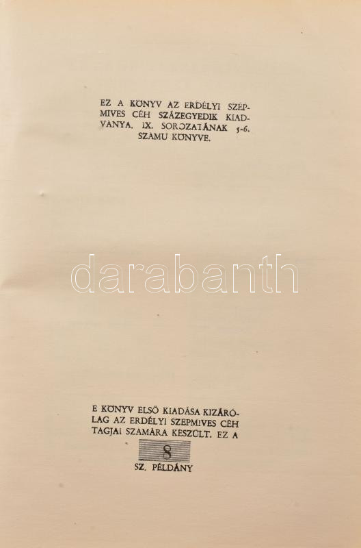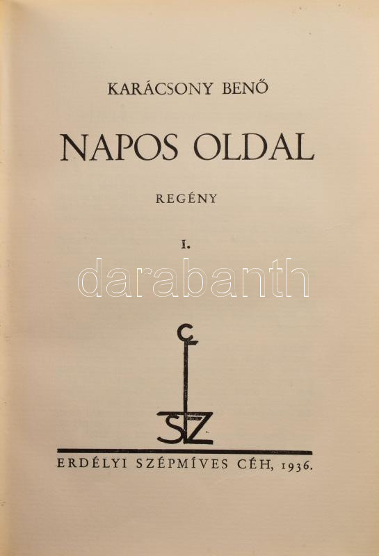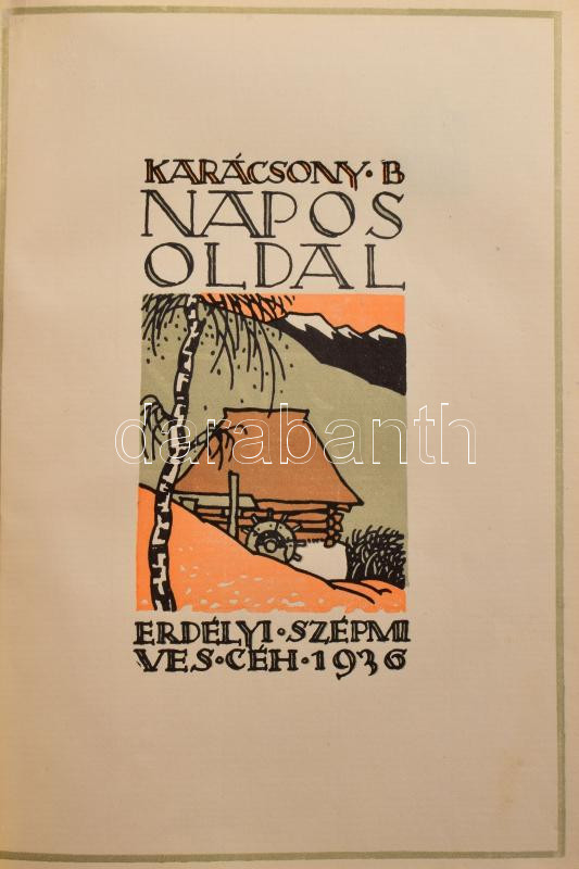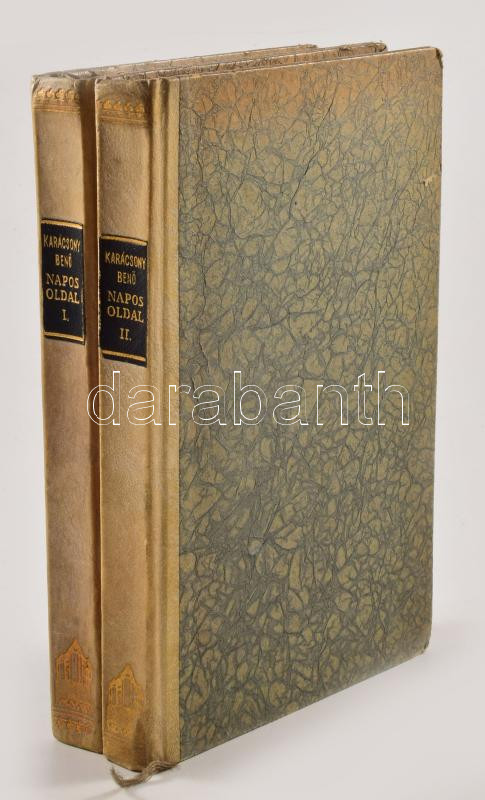 Leírás: Karácsony Benő: Napos oldal. I-II. köt. Erdélyi Szépmíves Céh 101-102. sz. kiadványa. Kolozsvár, 1936., Erdélyi Szépmíves Céh,(Minerva-ny.), 2 (díszcímlap) +229+3+IV (Erdélyi Szépmíves Céh tagjainak névsora) p.; 2+193+3+IV (Erdélyi Szépmíves Céh tagjainak névsora) p. 1. kiadás. Számozott, 8. számú és 18. számú előfizetők részére készült példány. Kiadói félpergamen-kötés, Rohonyi Antal-kötés, kopott borítóval.