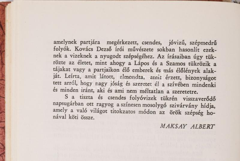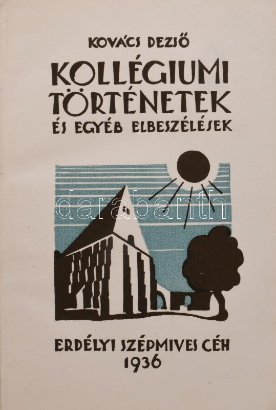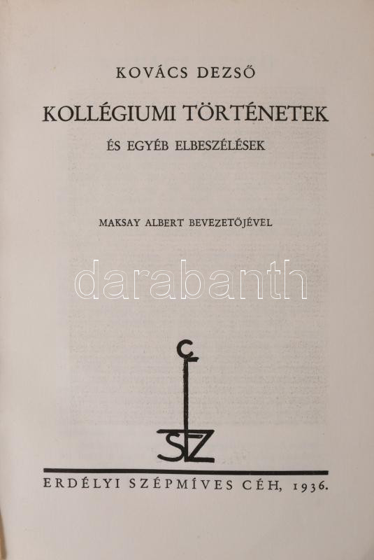 Kovács Dezső: Kollégiumi történetek és egyéb elbeszélések. Maksay Albert bevezetőjével. Erdélyi Szépmíves Céh 104. sz. kiadványa. Kolozsvár, 1936., Erdélyi Szépmíves Céh,(Minerva-ny.), 2 (díszcímlap)+2 p.+1 t.+157+3+IV (Erdélyi Szépmíves Céh tagjainak névsora) p. 1. kiadás. Számozott, 87. számú előfizetők részére készült példány. Kiadói félpergamen-kötés, Rohonyi Antal-kötés, kissé kopott borítóval.