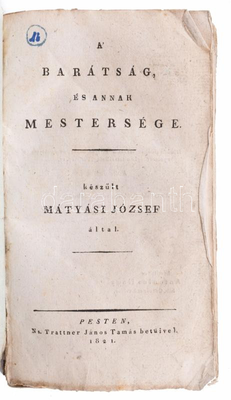 Mátyási József: A barátság, és annak mestersége Pesten, 1821. Trattner János Tamás. VIII, 220 l. 1 lev. A szerző költő, ügyvéd volt. Korábban galántai Fekete János gróf titkáraként működött. Költészetét Kazinczy lenézte, Csokonai azonban barátjaként tisztelte. Ritka.