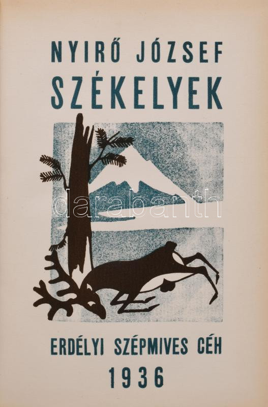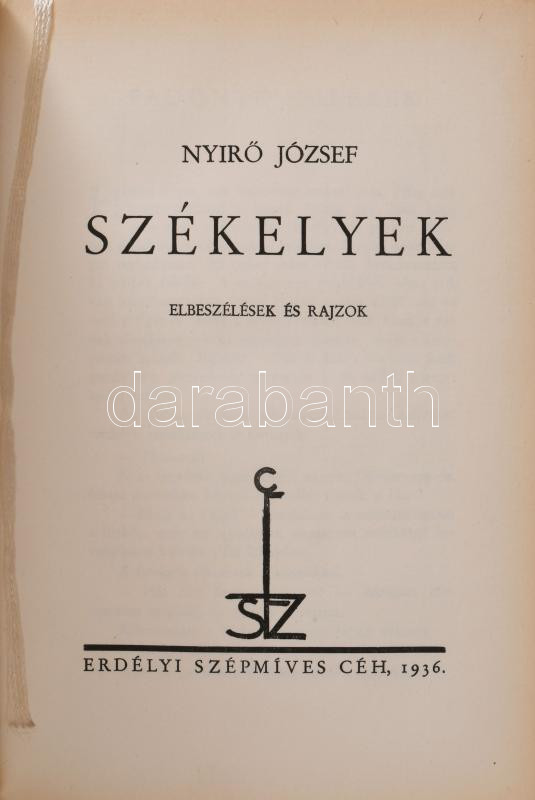 Nyírő József: Székelyek. Elbeszélések és rajzok. Erdélyi Szépmíves Céh 103. sz. kiadványa. Kolozsvár, 1936., Erdélyi Szépmíves Céh,(Minerva-ny.), 2 (díszcímlap)+184+4+IV (Erdélyi Szépmíves Céh tagjainak névsora) p. 1. kiadás. Számozott, 184. számú, előfizetők részére készült példány. Ex libris-szel, rajta Erdély címerével: "Ez a könyv az Erdélyi Szépmíves Céh tagja: Dr. Imre Sándor számára készült." Kiadói félpergamen-kötés, Rohonyi Antal-kötés, kopott borítóval.