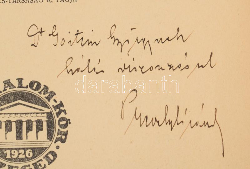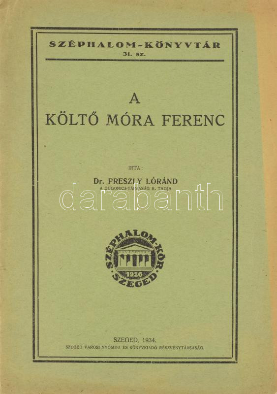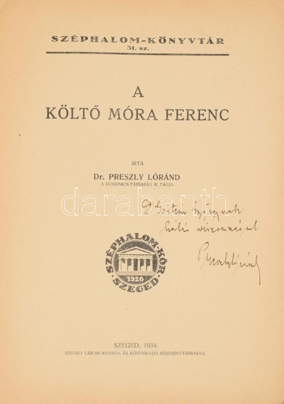 Preszly Lóránd: A költő Móra Ferenc. A szerző, Preszly Lóránd (1883-1953) író, csendőrezredes által Dr. Gotein György (1911-1945) Izraelita származású kaposvári gimnáziumi igazgató, irodalomtörténész, holocaust áldozat részére DEDIKÁLT példány.