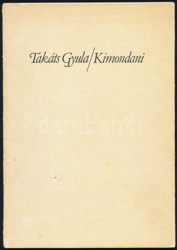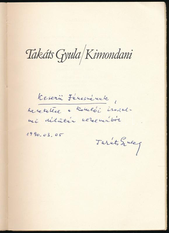Takáts Gyula: Kimondani. Würtz Ádám illusztrációival. A szerző, Takáts Gyula (1911-2008) Kossuth-díjas költő, író, műfordító által DEDIKÁLT példány! Pécs, 1981., Pécsi Szikra Nyomda, 29+1 p. Egyetlen kiadás. "Takáts Gyula születésének hetvenedik évfordulójára szeretettel és a költő iránti megbecsüléssel szedték és nyomtatták ezt a kis könyvet a Pécsi Szikra Nyomda dolgozói, ..." Kereskedelmi forgalomba nem került. Megjelent 300 példányban. Kiadói papírkötés.