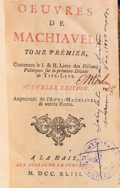 Tome Prémier: Discours Politiques de Nicolas Machiavel sur La I. Décade de Tite-Live. Livre Prémier - Livre Second.;