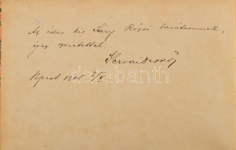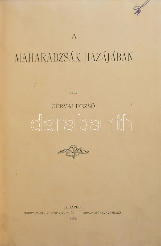 Gervai Dezső: A maharadzsák hazájában. A szerző, Gervai Dezső (1874-?) által DEDIKÁLT példány. Bp., 1905, Hornyánszky Viktor, 4+156+4 p. Oldalszámozáson belül egészoldalas és szövegközti fekete-fehér fotókkal illusztrált. Kiadói egészvászon-kötés, kopott borítóval, a gerincen apró sérülésekkel.