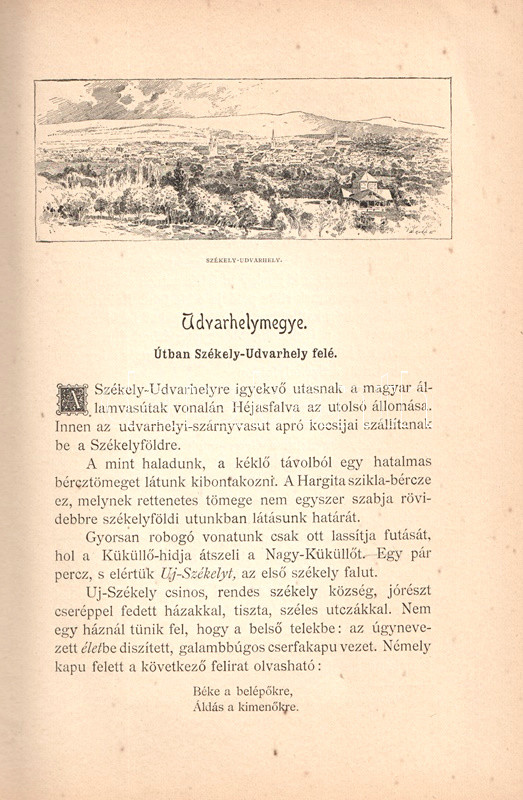 Hankó Vilmos (1854-1923) vegyész, ásványvíz-elemző, ismeretterjesztő író. A székelyföldi születésű szerző turisztikai-honismereti monográfiája Udvarhely, Háromszék, Csík és Maros vármegyéről, a megye székely népéről és városairól, természeti és épített örökségéről, gyógyüdülési és kirándulási lehetőségeiről, valamint ipari fejlődésének mozzanatairól. A kötetet a korszak vezető grafikusainak szövegközti és egész oldalas illusztrációi díszítik.