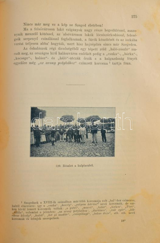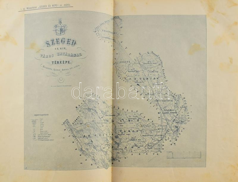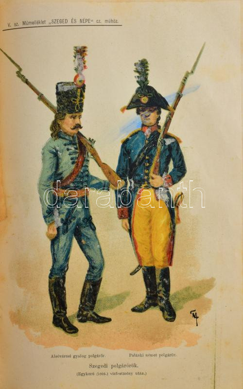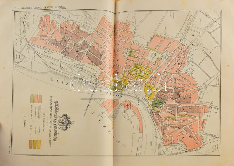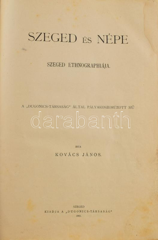 Kovács János: Szeged és népe. Szeged ethnographiája. A "Dugonics Társaság" által pályakoszorúzott mű. Szeged, 1901., "Dugonics-Társaság", (Endrényi Imre-ny.), 4+IV+516 p.+VI (mellékletek, ebből 3 színes chromolithográfia, 3 kihajtható térkép amiből 2 színes) t. Lapszámozáson belül gazdag fekete-fehér egészoldalas és szövegközti fekete-fehér képekkel, térképpel illusztrált. Korabeli aranyozott gerincű álbordázott félbőrkötésben, aranyozott lapélekkel, kopott borítóval, foltos lapokkal is.