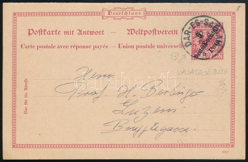 Német Kelet-Afrika ~1905 Válaszos levelezőlap / PS-reply card https://www.darabanth.com/hu/45-Nagyaukcio/45.1/Kulfoldi-filatelia-es-postatortenet/Nemet-gyarmatok~18947/Nemet-Kelet-Afrika-7E1905-Valaszos-levelezolap-PS-reply-card~II3439786