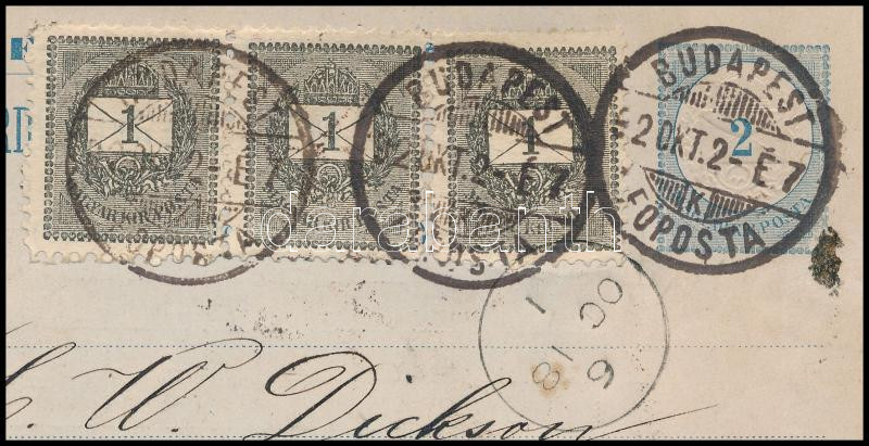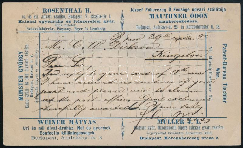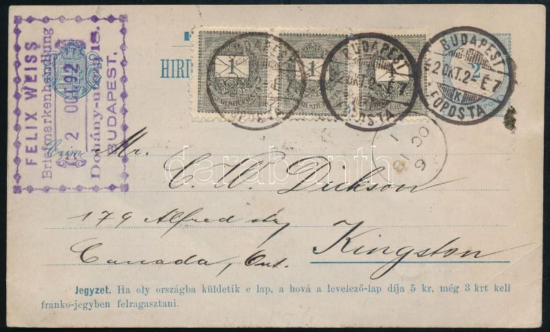1892 2kr díjjegyes hirdetményes levelezőlap + 3 x 1kr kiegészítéssel Kanadába. Ritka kiegészítés, általában 3kr bélyeggel ismerünk hasonlókat, ebben a formában igazi ritkaságnak számít! RRRR! / Advertising 2kr PS-card with 3 x 1kr additional franking to Canada. Rare combination, we know similar ones with 3kr stamp. RRR! "BUDAPEST / FŐPOSTA" - Kingston / Canada
