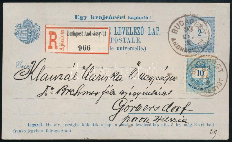 Leírás: 1893 2kr díjjegyes hirdetményes levelezőlap 10kr díjkiegészítéssel ajánlott lapként tarifahelyesen Sziléziába küldve. Kifogástalan és rendkívül ritka! RRR! / Advertisement 2kr PS-card with 10kr additional franking to Silesia. Very rare, RRR! "BUDAPEST / ANDRÁSSY ÚT" - Görbersdorf