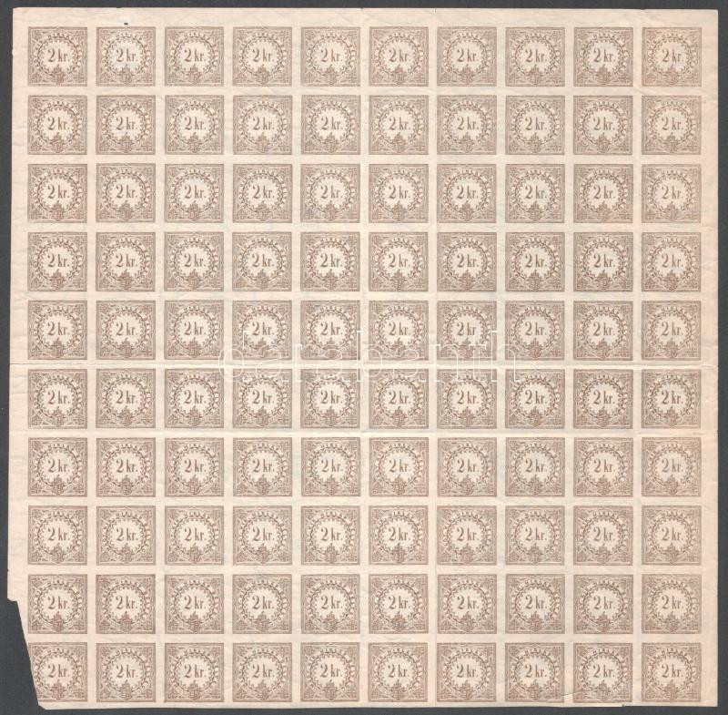 Newspaper duty stamp 2kr folded complete sheet of 100. Damaged, partly hinged, tears, creases, extremely rare, maybe unique.