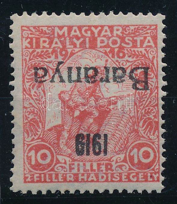 Leírás: Baranya I. 1919 Hadisegély 10f fordított felülnyomattal, apró falcmaradvánnyal / with inverted overprint, tiny hinge remnant