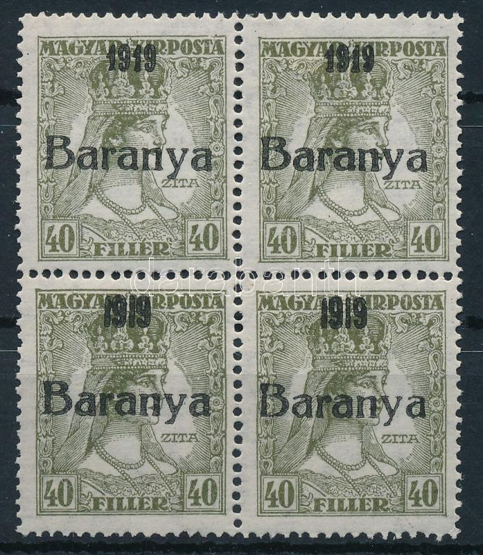 Leírás: Baranya I. 1919 Zita 40f négyestömb 2 bélyegen antikva számokkal / block of 4 with antiqua numbers