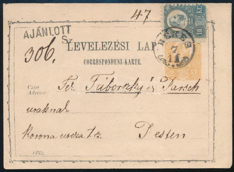Leírás: 1872 Ajánlott 2kr díjjegyes levelezőlap Réznyomat 10kr díjkiegészítéssel / Registered 2kr PS-card with Mi 11