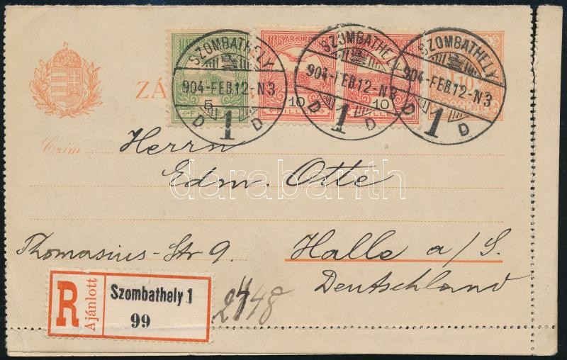 Leírás: 1904 Ajánlott 10f díjjegyes zárt levelezőlap Turul 5f + 2 x 10f díjkiegészítéssel "SZOMBATHELY" - "HALLE (SAALE)" / Registered PS-cover card with additional franking to Germany