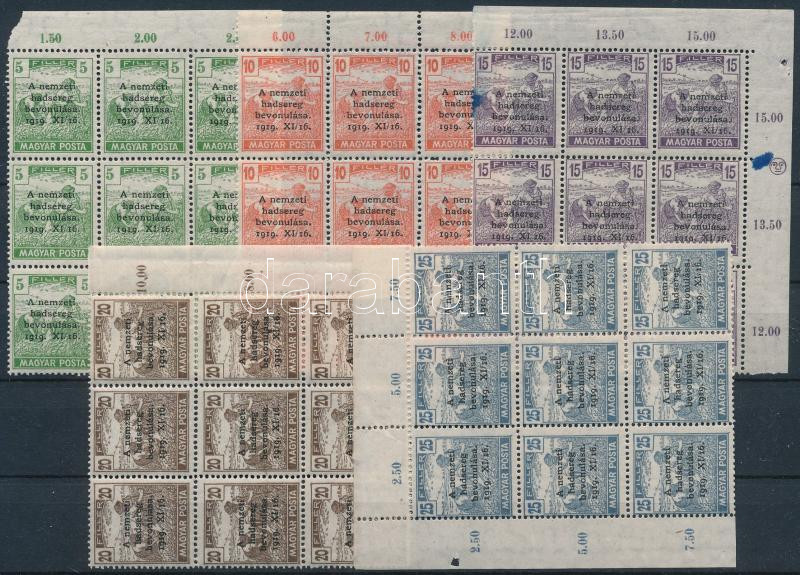 Leírás: 1919 Nemzeti Hadsereg sor ívszéli 9-es tömbökben (ráncok / creases, 15f tintafoltok / ink spots)