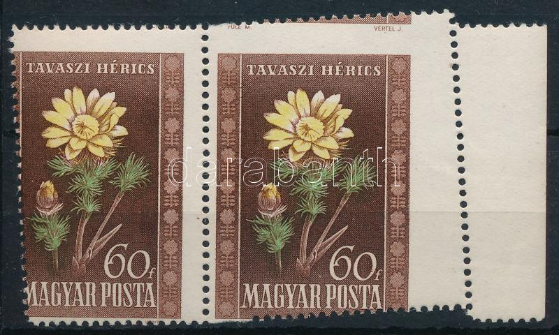 1950 Virág I. 60f ívszéli pár elfogazva / shifted perforation https://www.darabanth.com/hu/45-Nagyaukcio/45.1/Magyar-filatelia-es-postatortenet-Online/1946-1956-kozotti-kiadasok~18884/1950-Virag-I-60f-ivszeli-par-elfogazva-shifted-perforation~II3421010