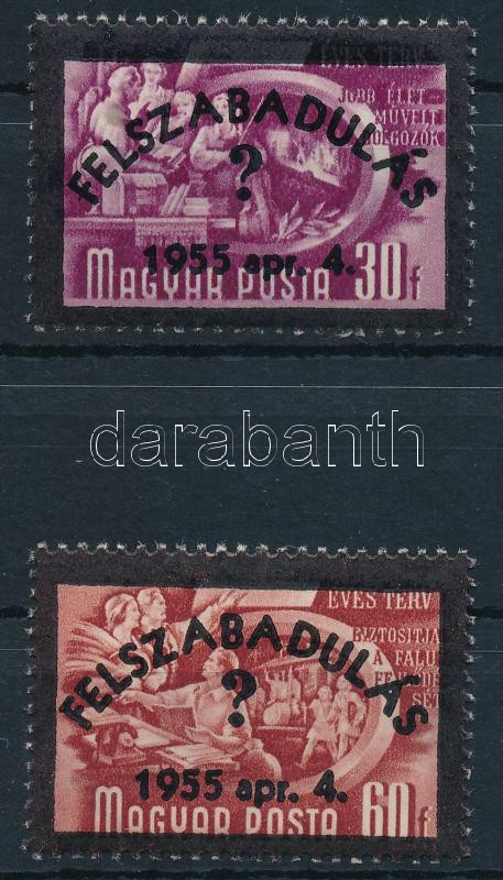 Leírás: 1955 Ötéves terv 30f + 60f bélyeg "FELSZABADULÁS ? 1955 ápr. 4." magánfelülnyomással (gumihibák) / Mi 1177 + 1179 with private overprint (gum disturbances)
