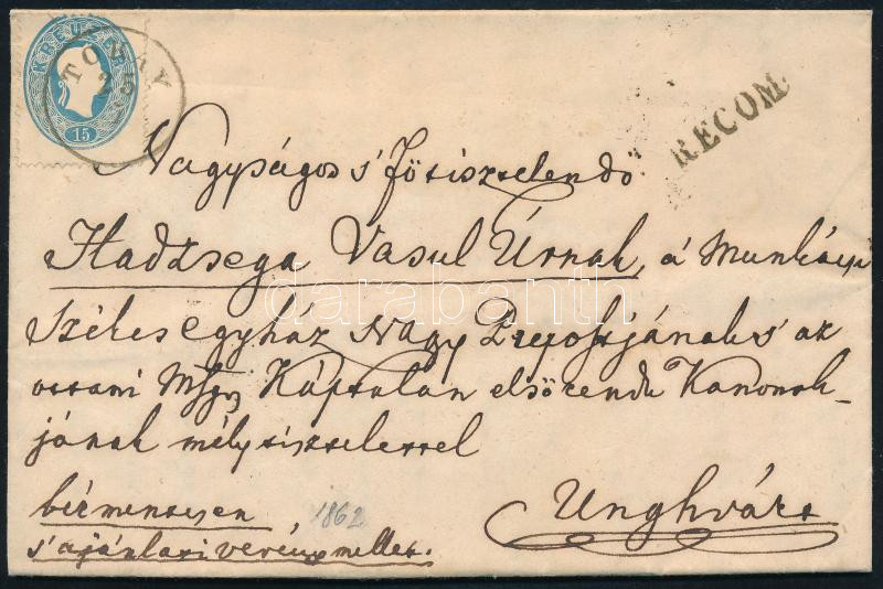 1863 15kr ajánlott levélen / on registered cover "TOKAY" https://www.darabanth.com/hu/45-Nagyaukcio/45.1/Magyar-filatelia-es-postatortenet-Online/Az-1861-es-kiadas~18729/1863-15kr-ajanlott-levelen-on-registered-cover-TOKAY~II3426980
