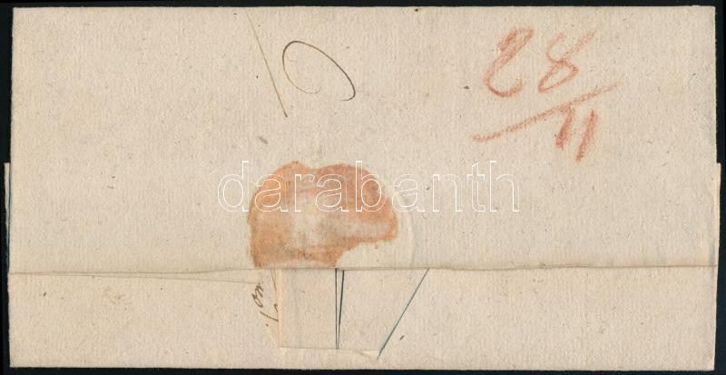 1821. október 8-án Nagyszebenben magánszemély által feladott, Miskolc portómentességét élvező hivatalának címzett, részben fizetett ajánlott levél. Súlyát a feladó a levél címoldalán 1,5 latban jelölte meg, amit a posta felülbírált és 2 lat súlyban számolt. A korabeli díjszabás szerint 18 postaállomáson túl 56 krajcárt kellett volna fizetni, de a címzett portómentessége miatt a levél feladásakor ennek a felét fizette a feladó + 4kr ajánlási díjat, amit a levél hátoldalán a posta feltüntetett. / Ex offo cover from Hermanstadt to Miskolc, with a 28 + 4kr paid fee instead of 56kr